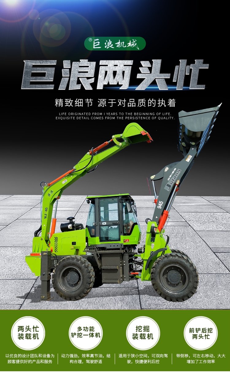 毗連復合舉措一拖二操縱手柄,簡介易操縱因為它具備配合的布局,前端是裝載裝備,后端為挖掘裝備。在施工時,操縱手只要求翻騰一下座椅,便能夠竣事從裝載機到挖掘機的修改。鏟挖一體機重要用于都會和村落的公路建造及保護、電纜鋪設、電力和機場工程、市政建造、農田水利建造、村落室第建造、開山取石和各類小型修建隊所處置的各類修建施工工程。“兩端忙”歸于小型多功效工程機器的一種,普通在大工程竣事后的小工程中應用。它可配多種功課裝備及輔具,停止挖掘、鏟裝、路面破裂、平坦場合、開挖溝渠、鋪設管道等多種功課。
